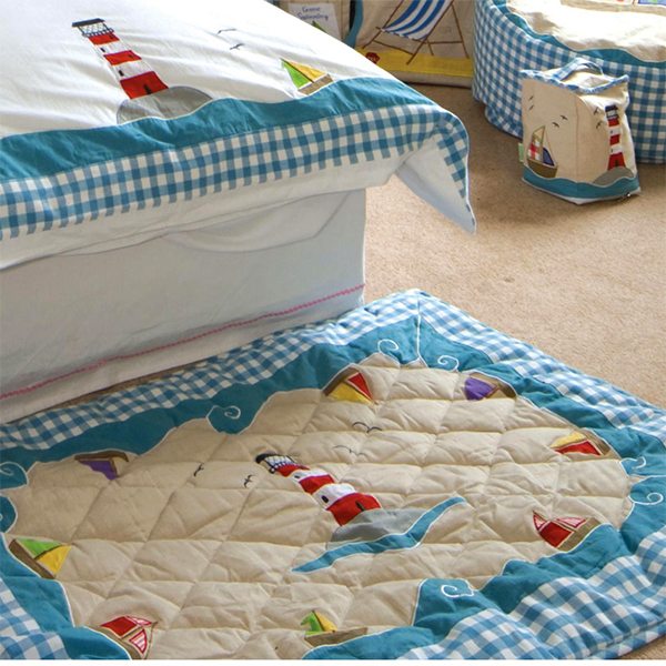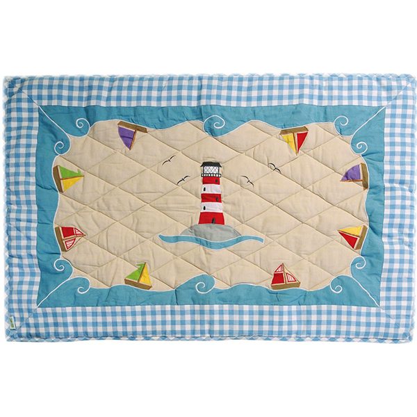 Deze gewatteerde Quilt past in het boothuis op de vloer maar natuurlijk kan die ook dienen als speelkleed of sprei.