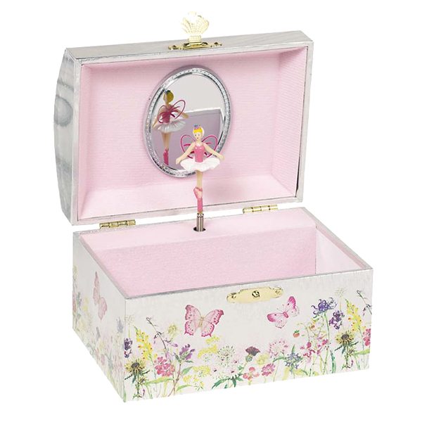 Een zilveren speeldoosje met een elfje in een bloemenveld. Maar als het doosje open gaat danst ze in het rond.