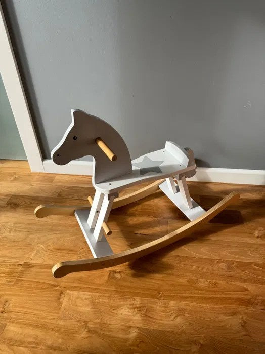 Paardrijden, welk kind wil dat niet met dit fijne, elegante, Scandinavische hobbelpaard. Wordt geleverd als bouwpakket. Eenvoudig te monteren met afneembare veiligheidsstang.