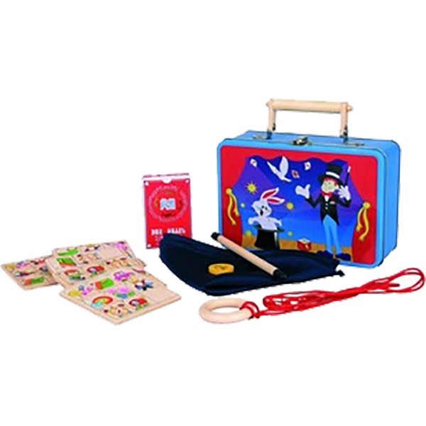 Inhoud: Handleiding met 7 goochelkunsten, toverkaarten, toverdoek, snel knopen, zwevende toverstok, houten tover-ring, tovermunt en een veranderende Poker.