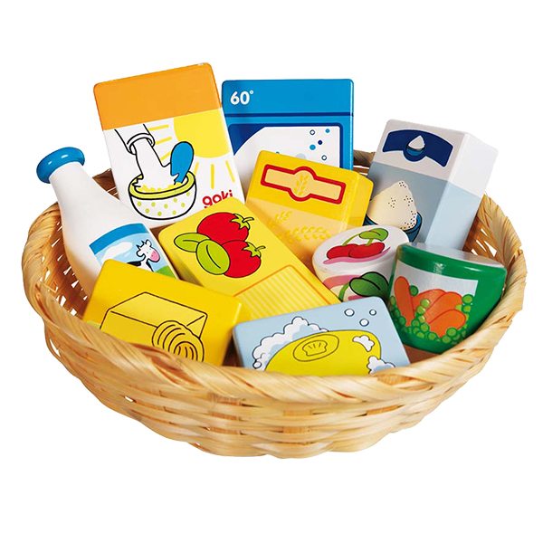 Een mand vol boodschappen uitgevoerd in hout. Fles melk, cornflakes, meel, waspoeder, roomboter, roomboter, kersenjam,suiker,doperwten, zeep, bouillonblokjes.