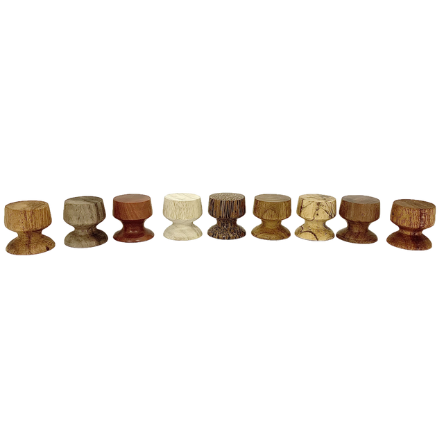 9 bekers - 3cm lang bij 3,5cmD. De gebruikte houtsoorten zijn Teak, Waru, Sapodilla, Java Teak, Kokosnoot, Tamarinde, Suar, Sono en Krokodil.