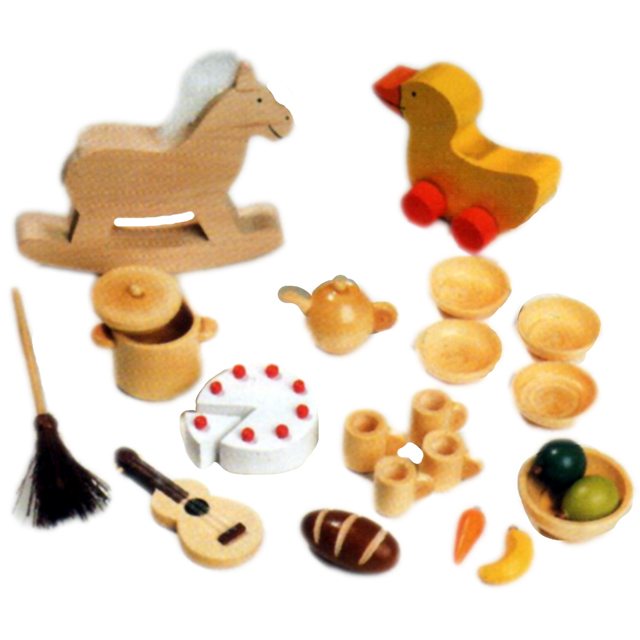 - 23-delig: hobbelpaard, eend, bezem, gitaar, pan, theepot, fruit op schaal, 4 bordjes en 4 mokken, taart en brood.