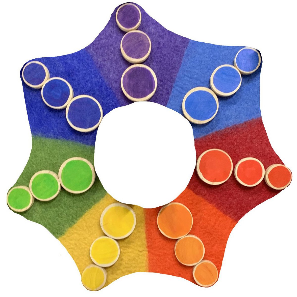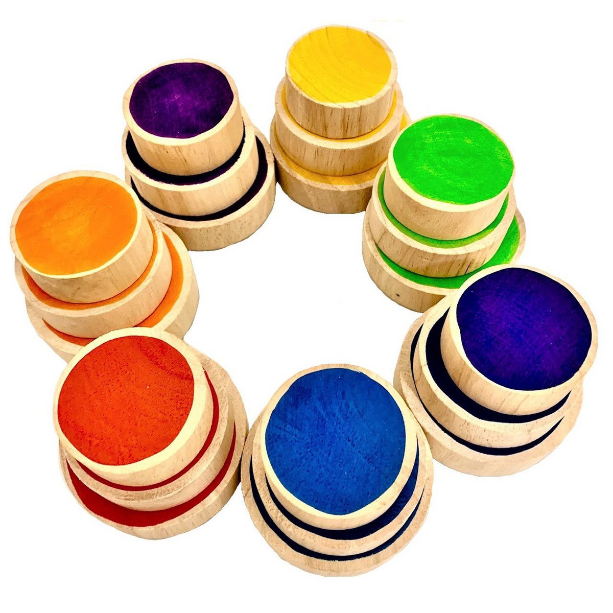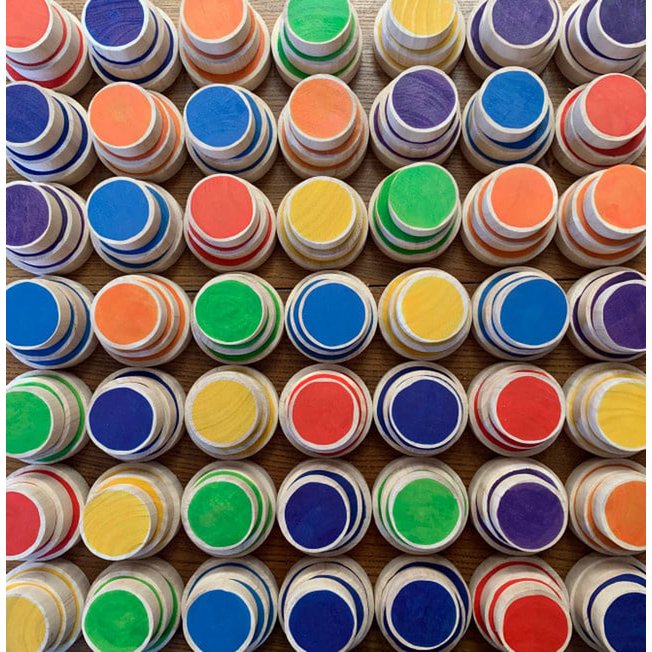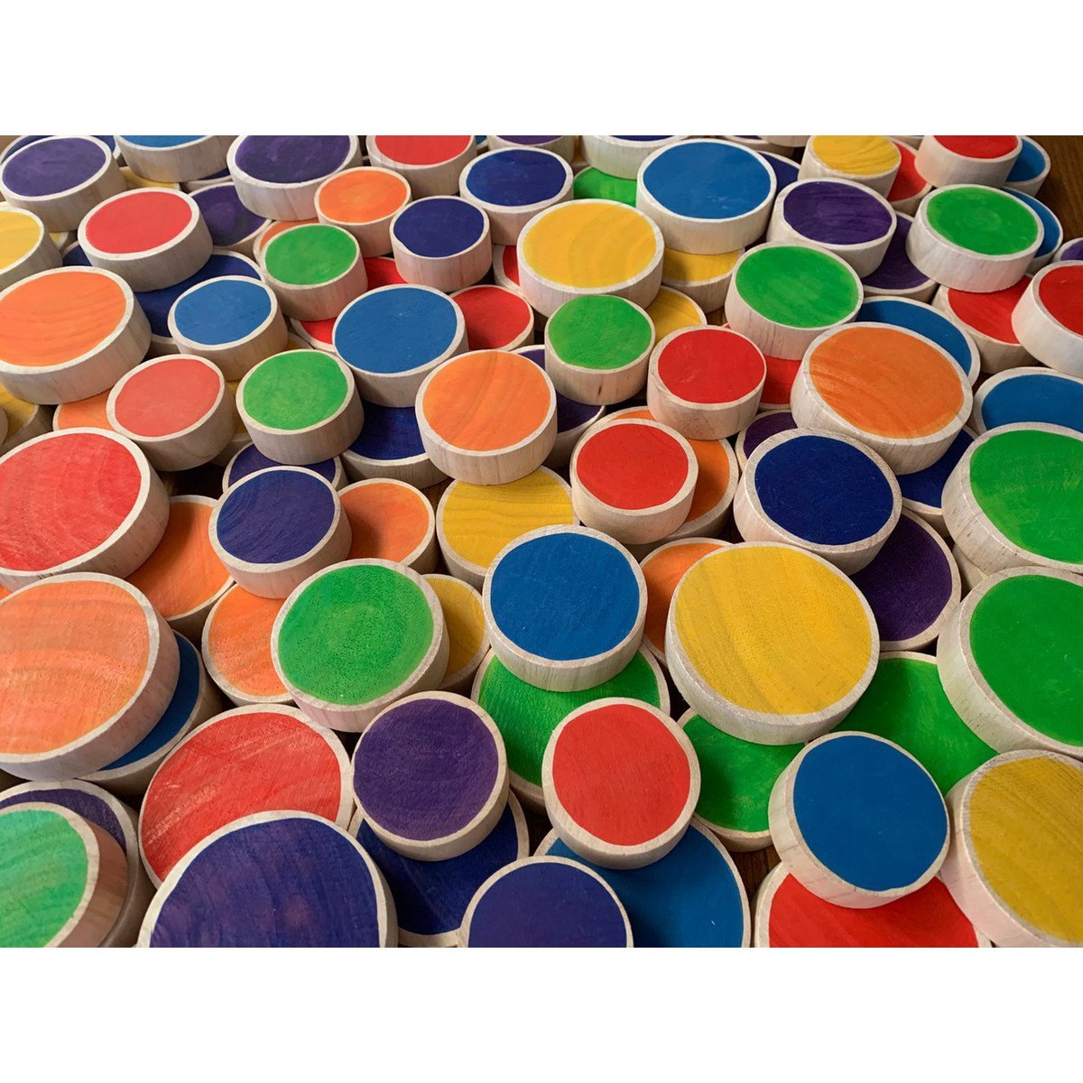 Houten schijven, 5-6-7 cm diameter en 2 cm dik, met de hand beschilderd in onze regenboogkleuren, 7 partijen van 3 = 21 stuks in totaal.