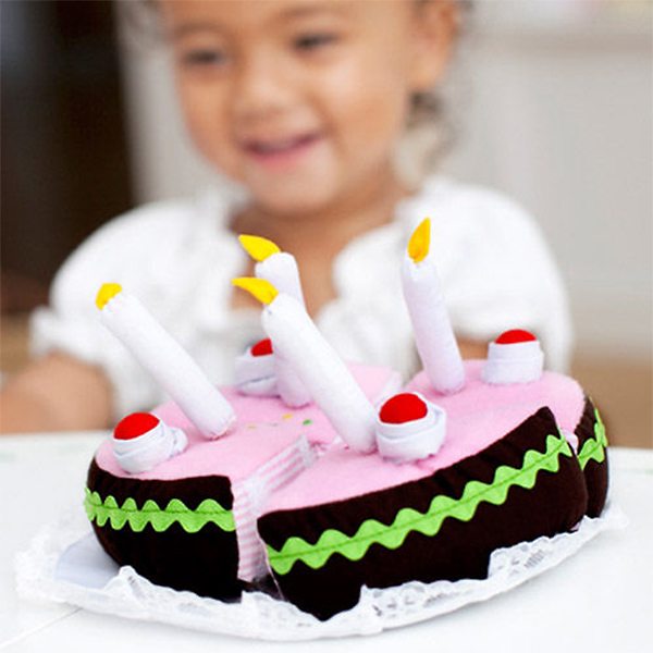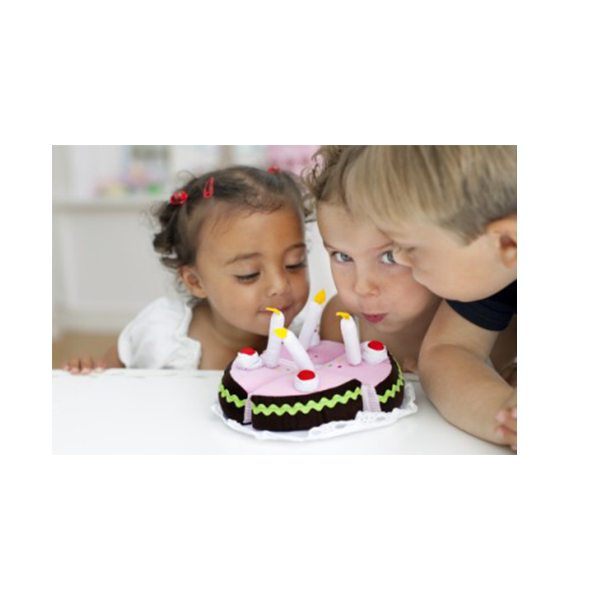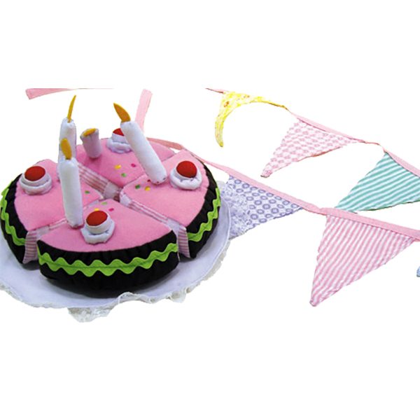 Deze verjaardagstaart met 4 afneembare kaarsjes is te verdelen in 4 stukken. Met de meter lange slinger maakt het de verjaardag van poppejans een heus feest.